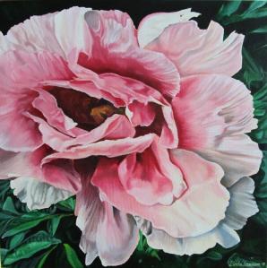 Här är min Pink Surprise, avslutad med bakgrund. Det blir lite skillnad… Den gula (ockra) bakgrunden på bilden nedan är ett tunnt färglager som jag förbereder alla dukar med innan jag målar. Den ska inte synas när målningen är färdig.