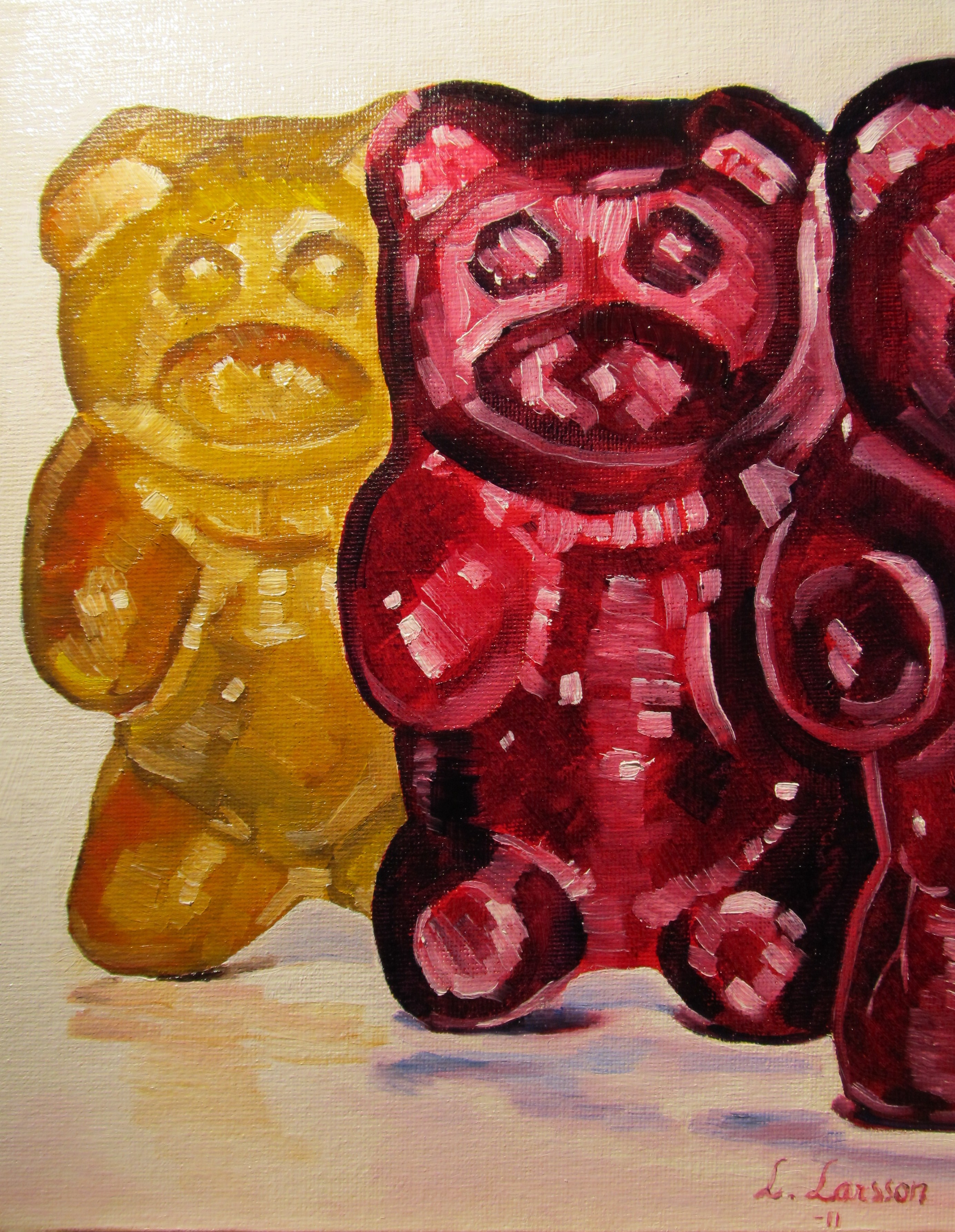 Så just nu blir det många små målningar, och mer impressionistiskt målade. Funderar på att göra en och annan fotorealistisk miniatyr också, men det är bara så skönt att kunna påbörja och avsluta samma målning på en dag. Så håll till godo med dagens målning, tre små blyga gummy bears…