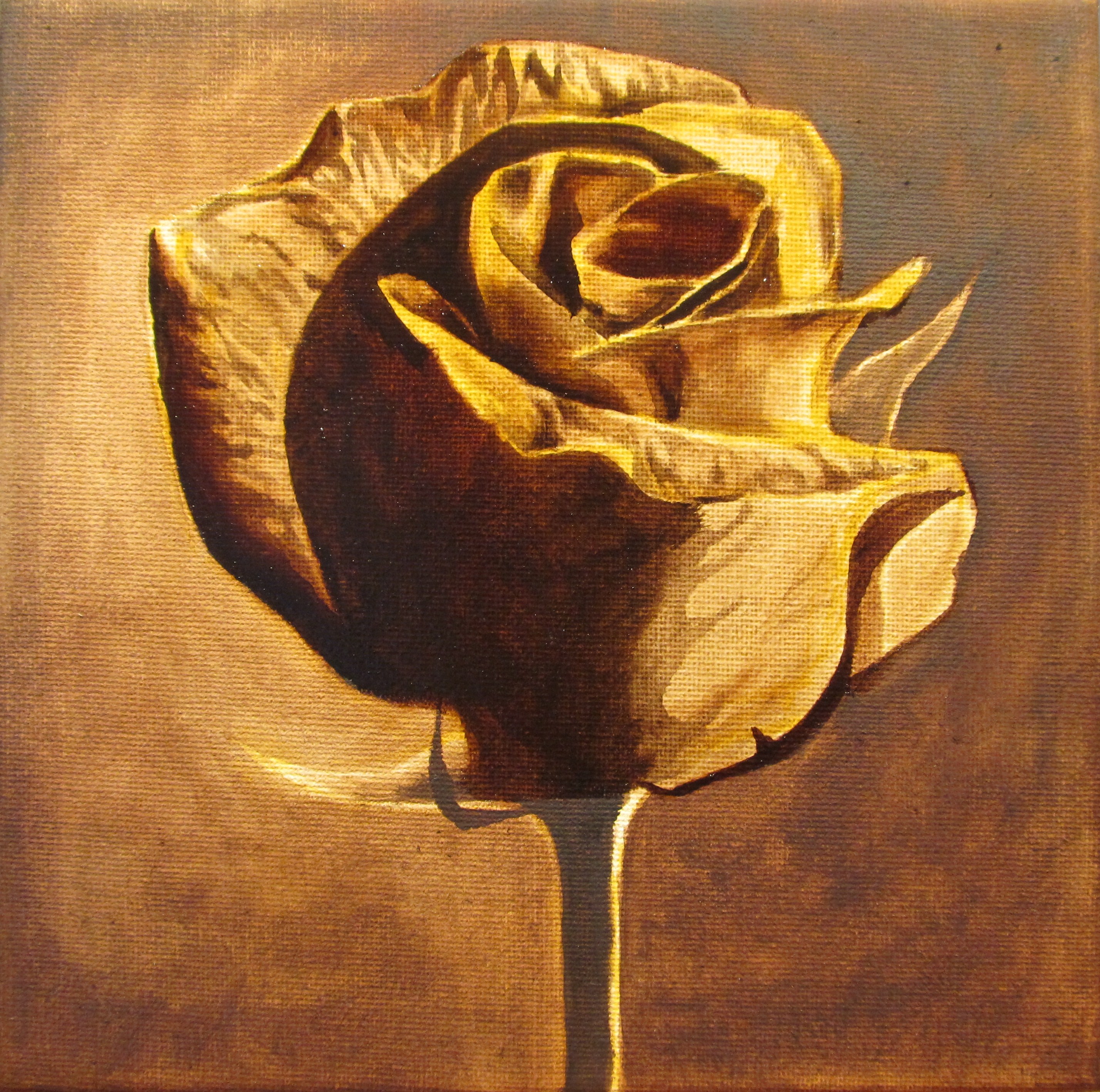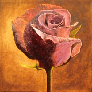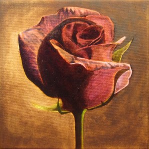 Första färglagret. Alazarin Crimson och lite ultramarine blue (för att rosen ska bli lila), lite grönt på blad och stjälk och lite zinkvit (en svag vit). Jag har penslat på ett tunt lager oljemedium, torkat av överflödet, och sedan börjat ”gnugga in” lite lite färg i taget på den oljade duken. Till detta använder jag mkt mjuka syntetpenslar för akryl. Akvarellpenslar av mårdhår eller syntet är också bra. Svinborstpenslar (vanliga oljefärgspenslar) gören sig icke besvär.