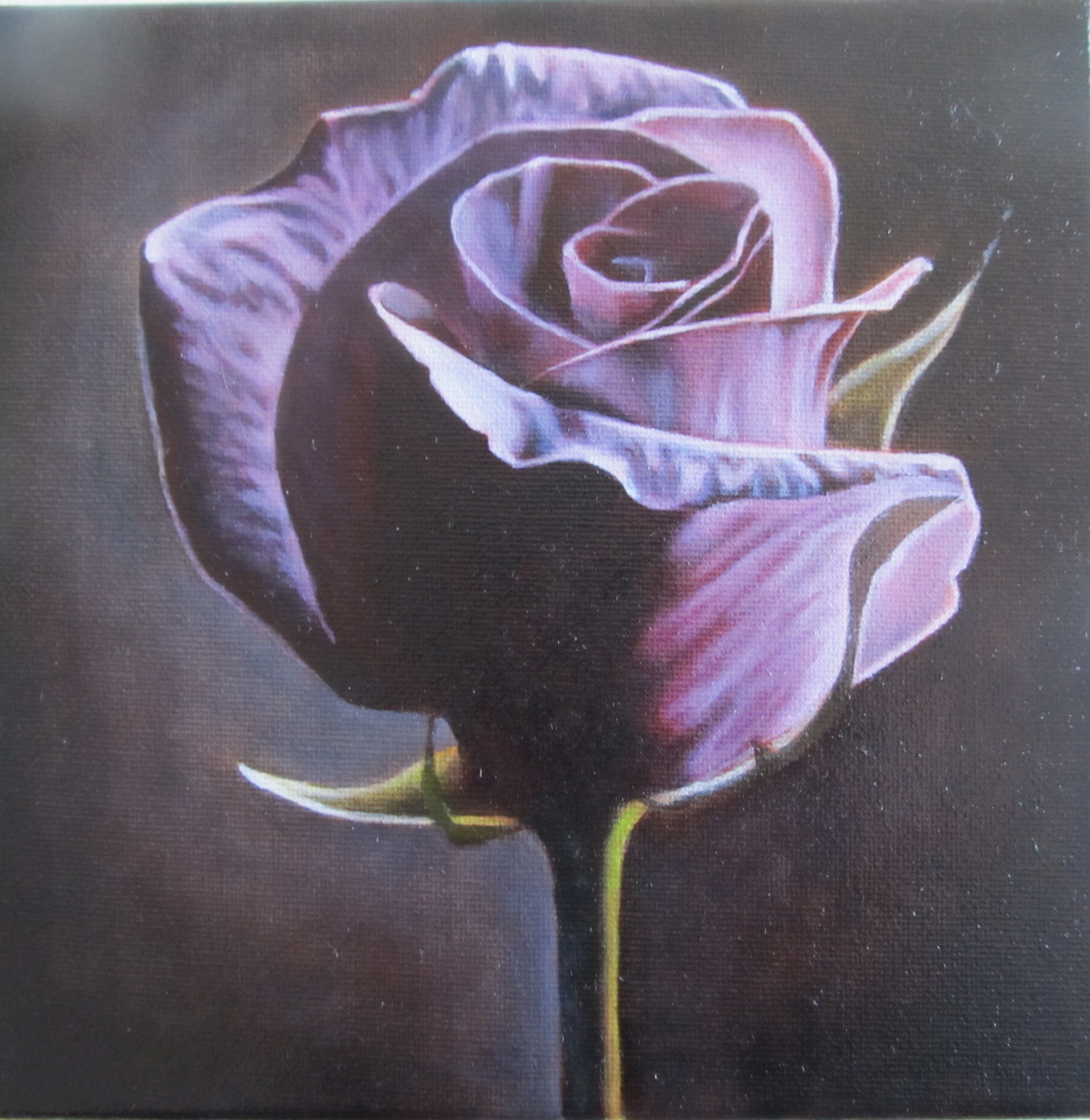 MEN jag blev så förvånad när jag insåg att rosen som är mörklila blir varmt lila-rosa när den hamnar under en stark belysning. Detta beror på att översta lagret är transparent så att ljuset färdas genom det översta mörkare lagret (som innehåller mer blått) och träffar lagret under detta, som domineras av alazarin crimson, en varmt rosaröd ton, och reflekteras sedan tillbaka ut igen. Jag visste om att man kan få effekter som denna, men kära nån vad det blev tydligt nu. Det var verkligen en markant effekt. Jag känner att jag blivit en rejäl erfarenhet rikare idag.