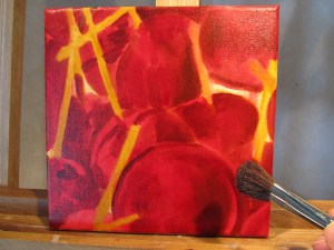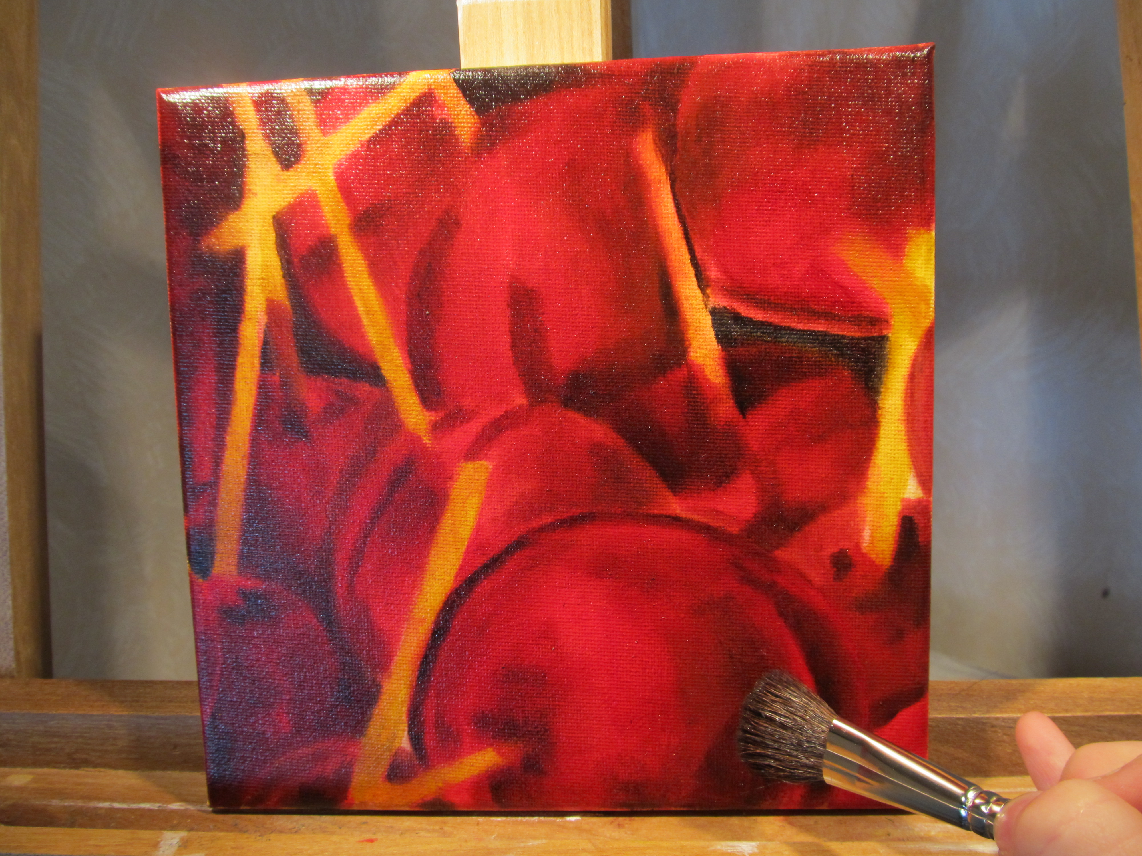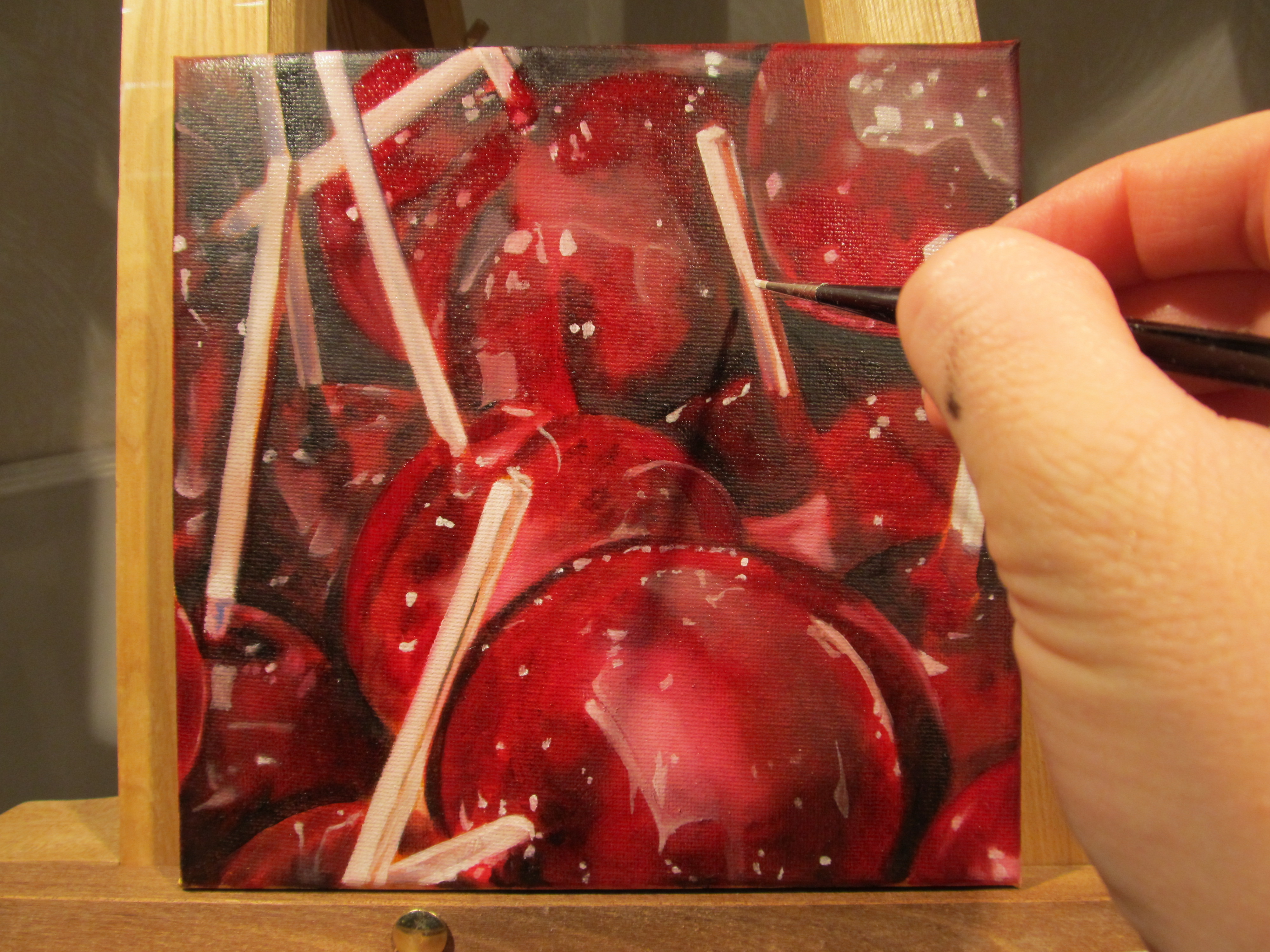 Här gjort en serie med bilder för att visa hur jag gick tillväga för att göra en målning med kanderade äpplen. Jag har inte gjort någon grisaille här (svartvit undermålning) men däremot en undermålning där jag blockar in de underliggande färgfälten, i detta fall röd och gul, som jag lät torka innan jag fortsatte med resten. Målningen är alltså gjord i två lager.
