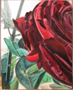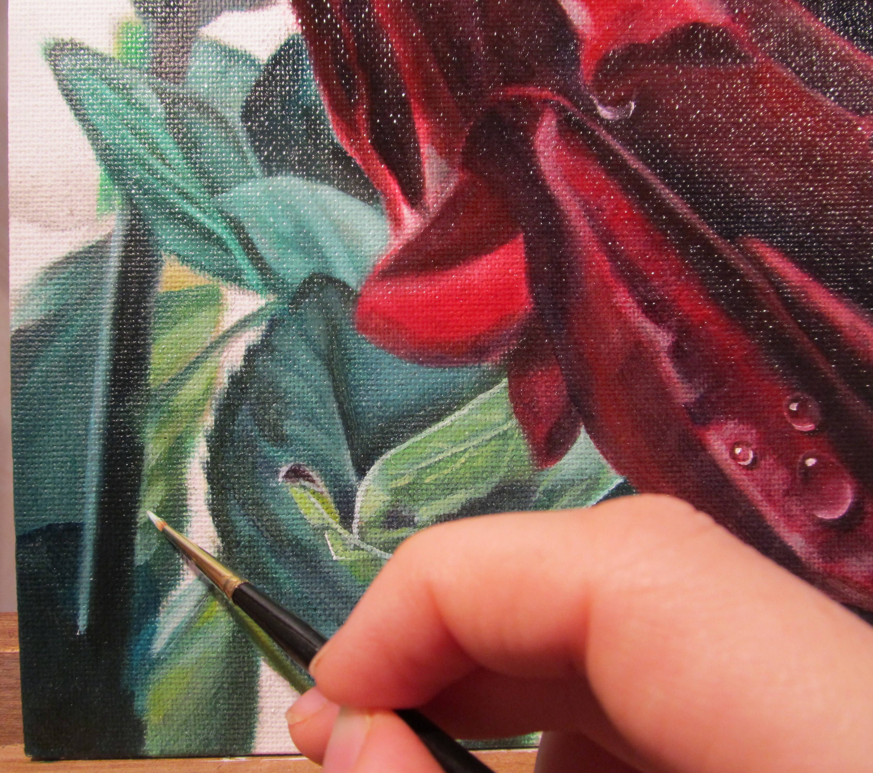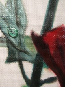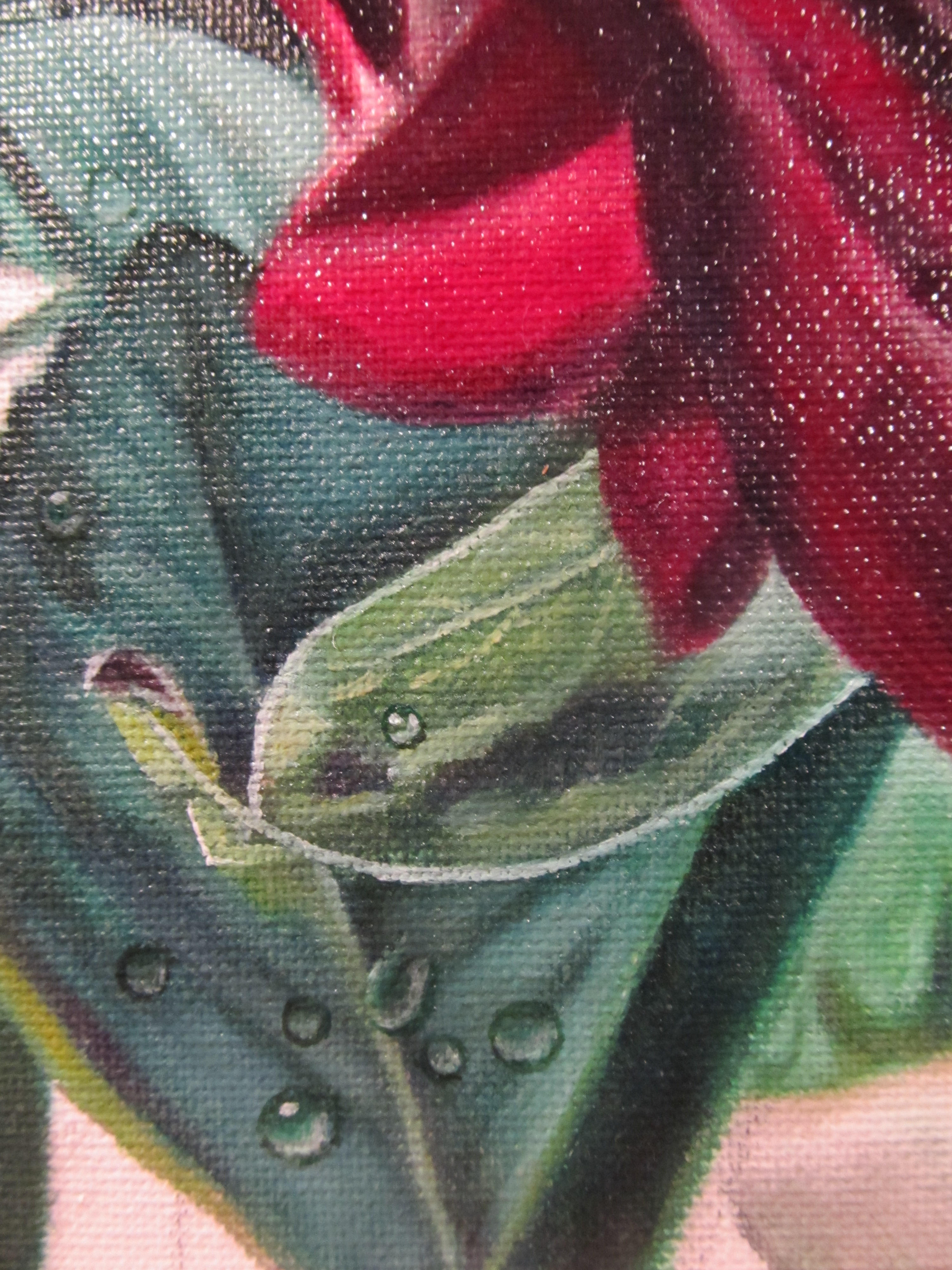 I denna målning har jag gjort något jag aldrig gör annars – hittat på saker som inte finns i mitt referensfoto. Här har jag målat ett helt gäng fantasidroppar som inte fanns :) Gick rätt bra tycker jag, som inte brukar måla droppar. Jag tycker i allmännhet att daggdroppar på blommor är en sån kliché, men min favoritkonstnär Delmus Phelps hävdar att vattendroppar är ett av de bästa sätten att särskilja sin konst från alla andra.