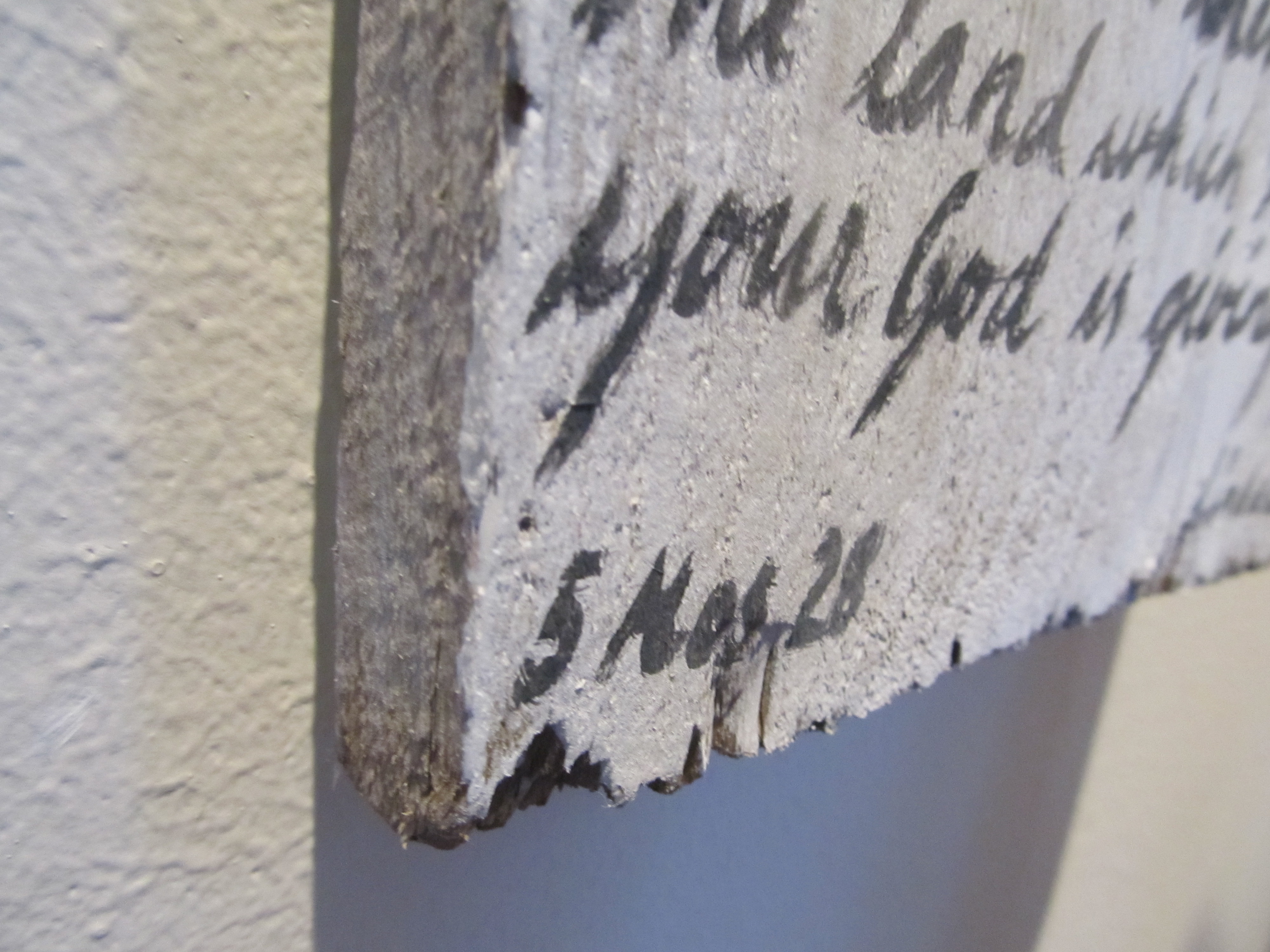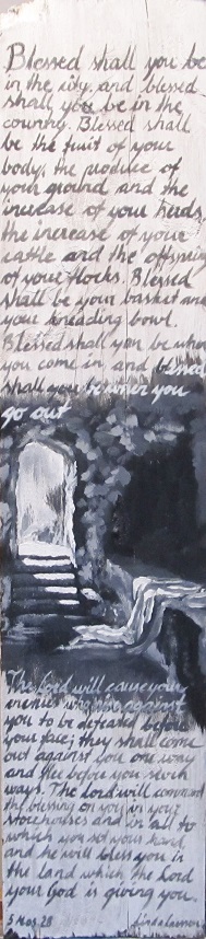 Alltså det var ju bara så roligt med denna ved på baksidan! Jag tog den största planka jag hittade (av de små, orkade inte såga en lång) och målade ner en stor del av 5 Mosebok 28 (förbundets välsignelser) på den. Detta är något jag funderat på länge :) Fast på en avlång canvasduk då…