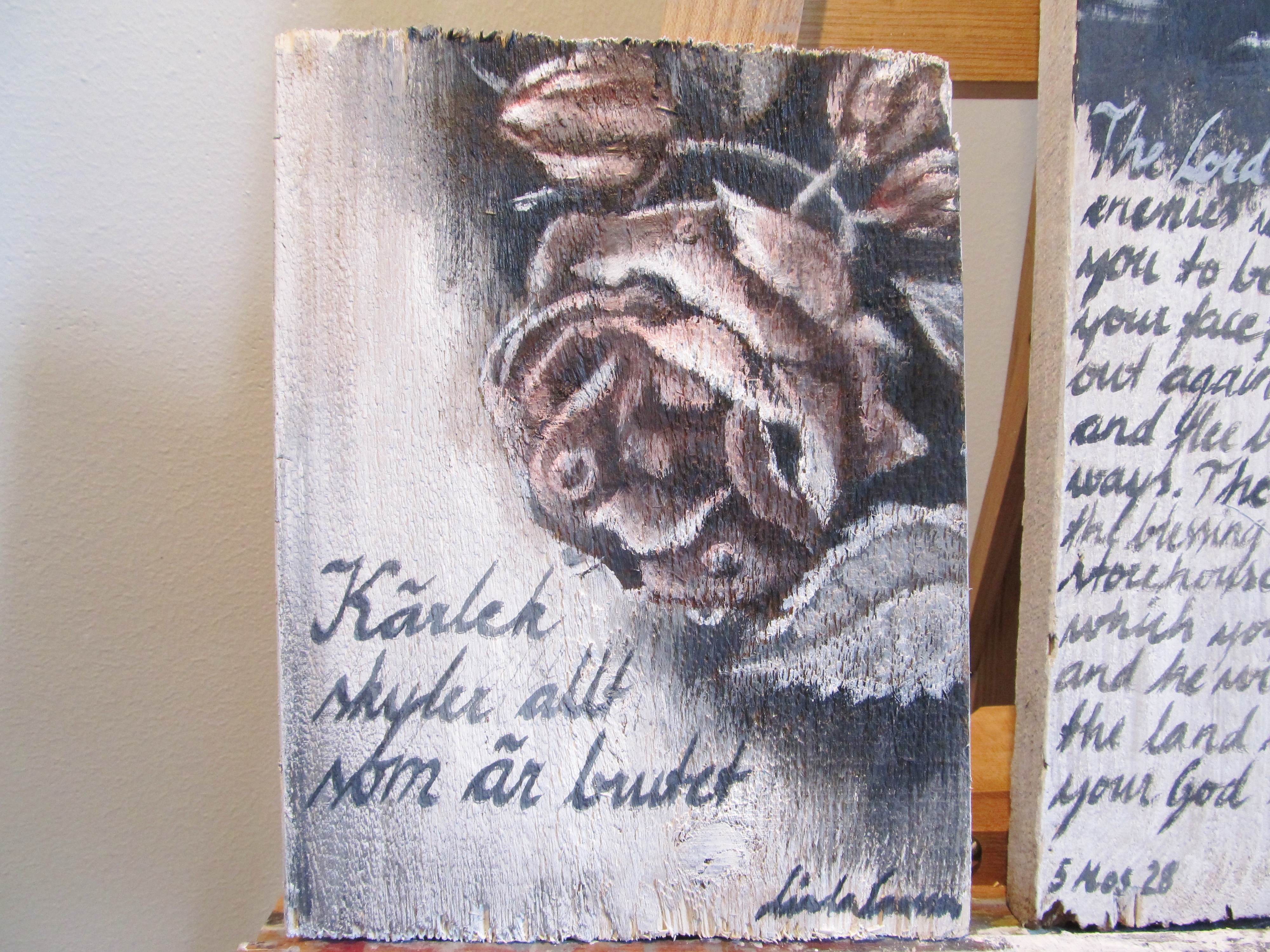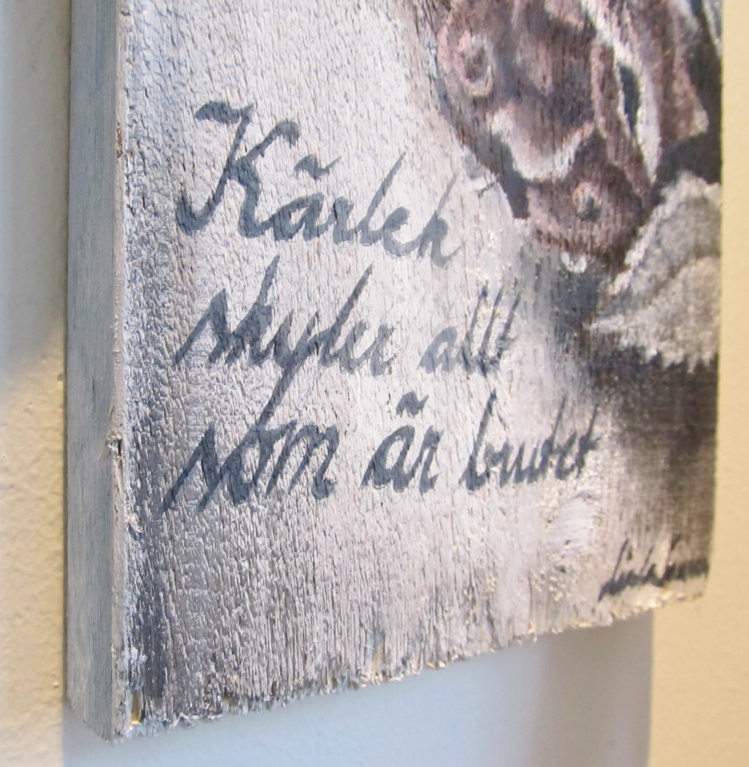 ”Kärlek skyler allt” Akryl och olja på ohyvlad bräda, 25×19 cm, 300 kr