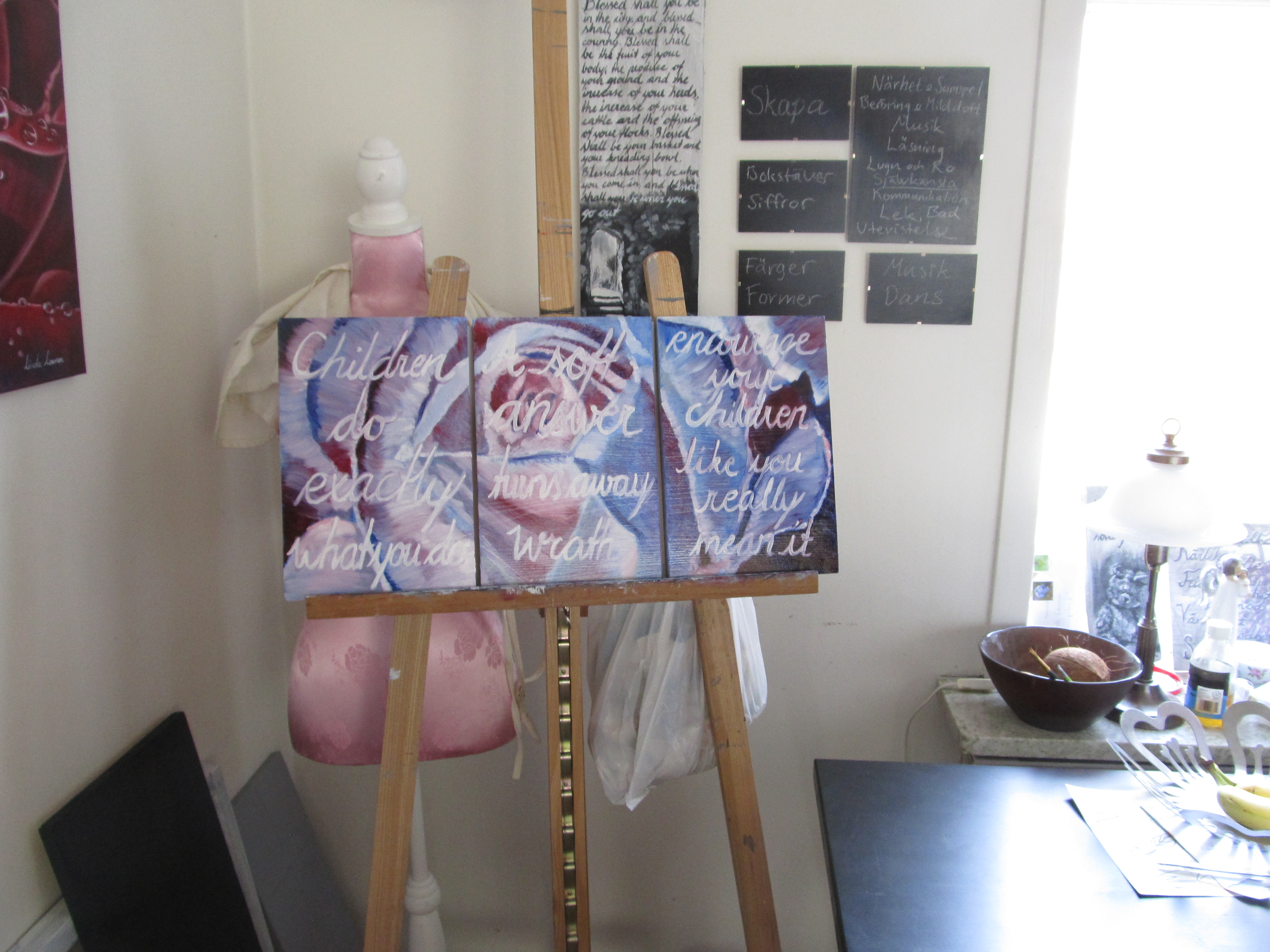 En liten triptyk (tredelad tavla) till mig själv :) (Tänk bort brödrosten) Jag har dagligen så många hjälpsamma ord som korsar mitt huvud då jag ber Gud om hjälp med vardagens små och stora utmaningar med barnen. En del ganska enkla, och andra helt genialiska (enligt mig ;) Jag brukar oftast klottra ner dom på en liten lapp och slänga in i min ateljéhylla eller lägga nånstans i köket där de försvinner. En del blir låttexter, och andra, ja.. försvinner. Jag vill ju inte heller ha en massa lappar på väggarna. En viss huslig estetik är ändå trevligt.