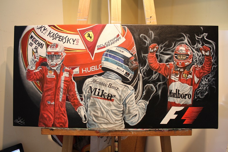 Some more color done on the helmet in the background (yellow and more red) and some other details elsewhere, both yellow, orange and blue. Flames next, highlights (all over) and the lower parts of the big helmet.
