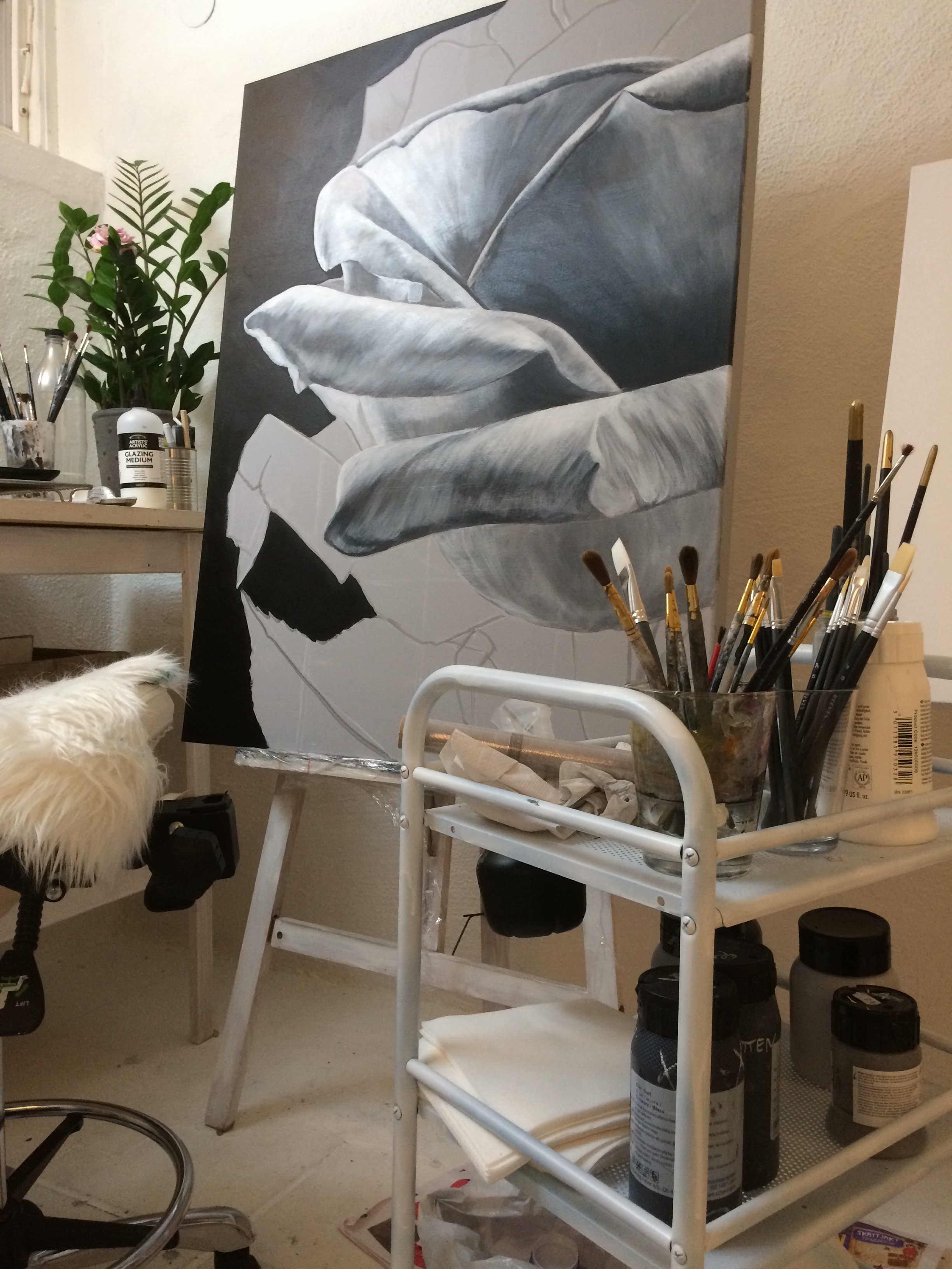 Vad gäller materialet i sig, så kommer du även att automatiskt prova fram och tillbaka, tex mellan olika penslar, för att till sist landa i ett sätt att använda de olika penslarna på ett sätt, som bara är DU. Detta kommer du bara fram till genom att lägga massor med tid på ditt skapande. Måla tjockt, måla tunt, skissa med kol, skissa med krita. Testa så mycket du kan. Om du har ett driv att lära dig, och en passion för det du gör, så har du det som krävs för att komma framåt. Men försök aldrig någonsin att vara någon annan.