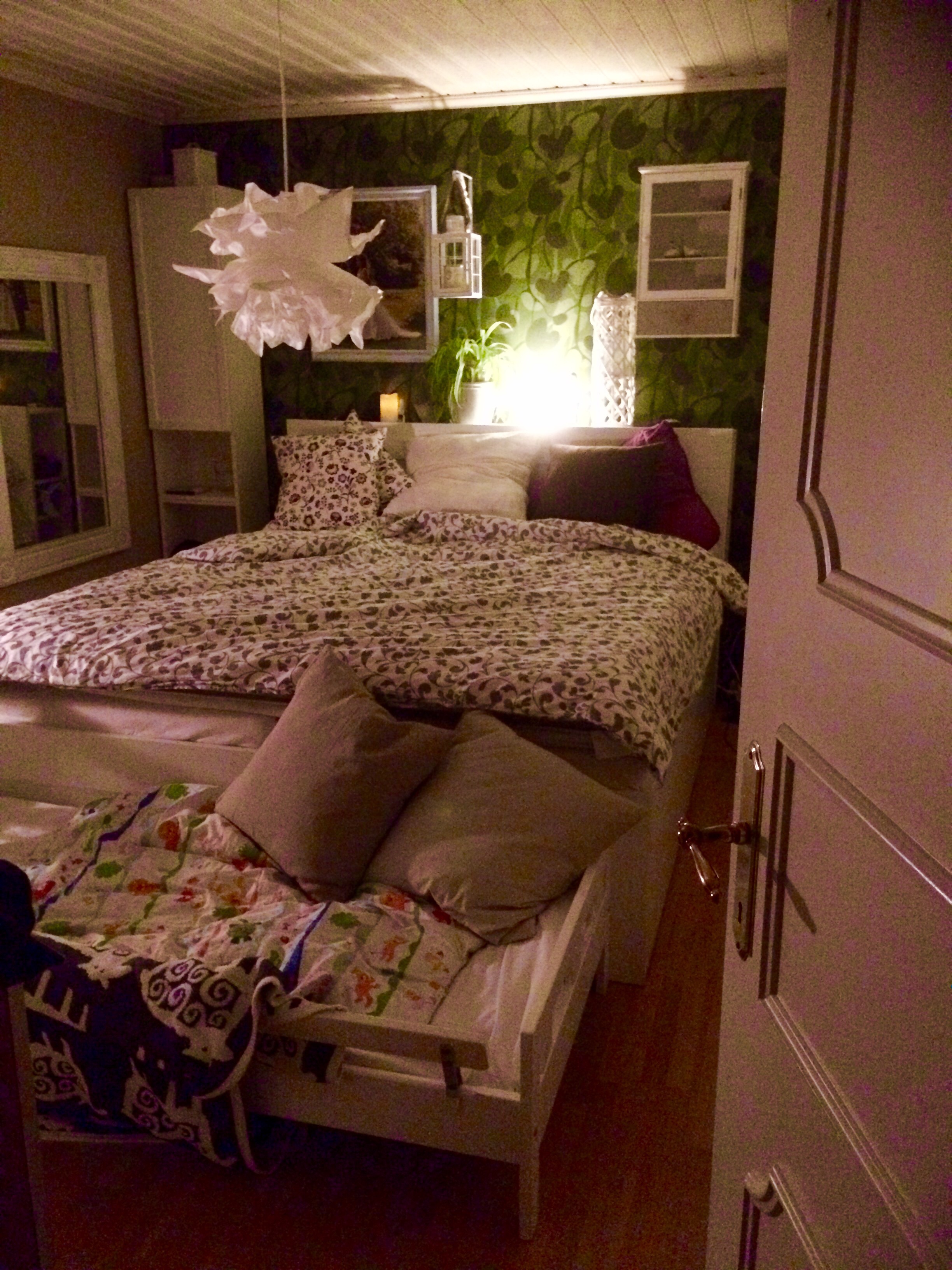 Jag är så glad att vi utan trängsel också lyckats placera en juniorsäng vid fotänden. Oftast ligger ingen där. Men då och då inträffar några märkliga dagar när ALLA barnen ska upp och krångla i omgångar samma natt! Och då, i takt med att dom droppar in på föräldracentralen, så kan man forsla ner den första (som redan somnat om) i den andra sängen. Nr 2 som vaknar hannar i mitten på dubbelsängen. När trean vaknar får en av oss gå och lägga sig med det barnet i dess egen säng (nu har alla äntligen vuxenstorlek på sängarna).