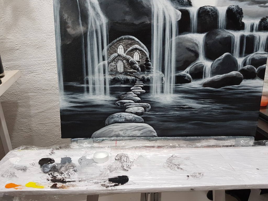 Kvällen är här :) Och jag har visst glömt plasta över färgerna från igår ser jag… haha… stenhårda. Hade tänkt måla lite mer på denna nu. Får hälla upp ny färg tyvärr. (Men jag brukar sällan glömma plasten.)