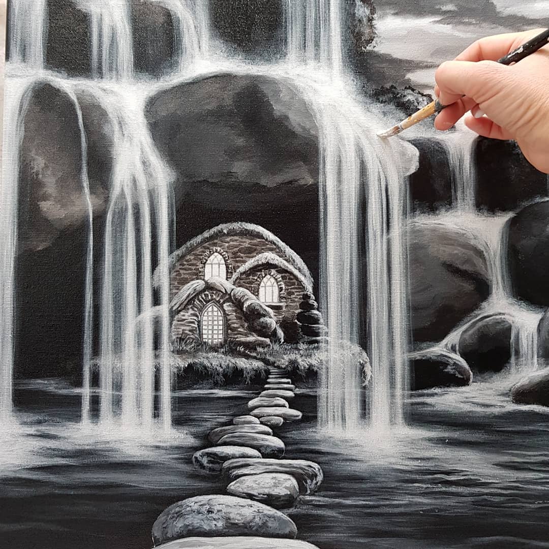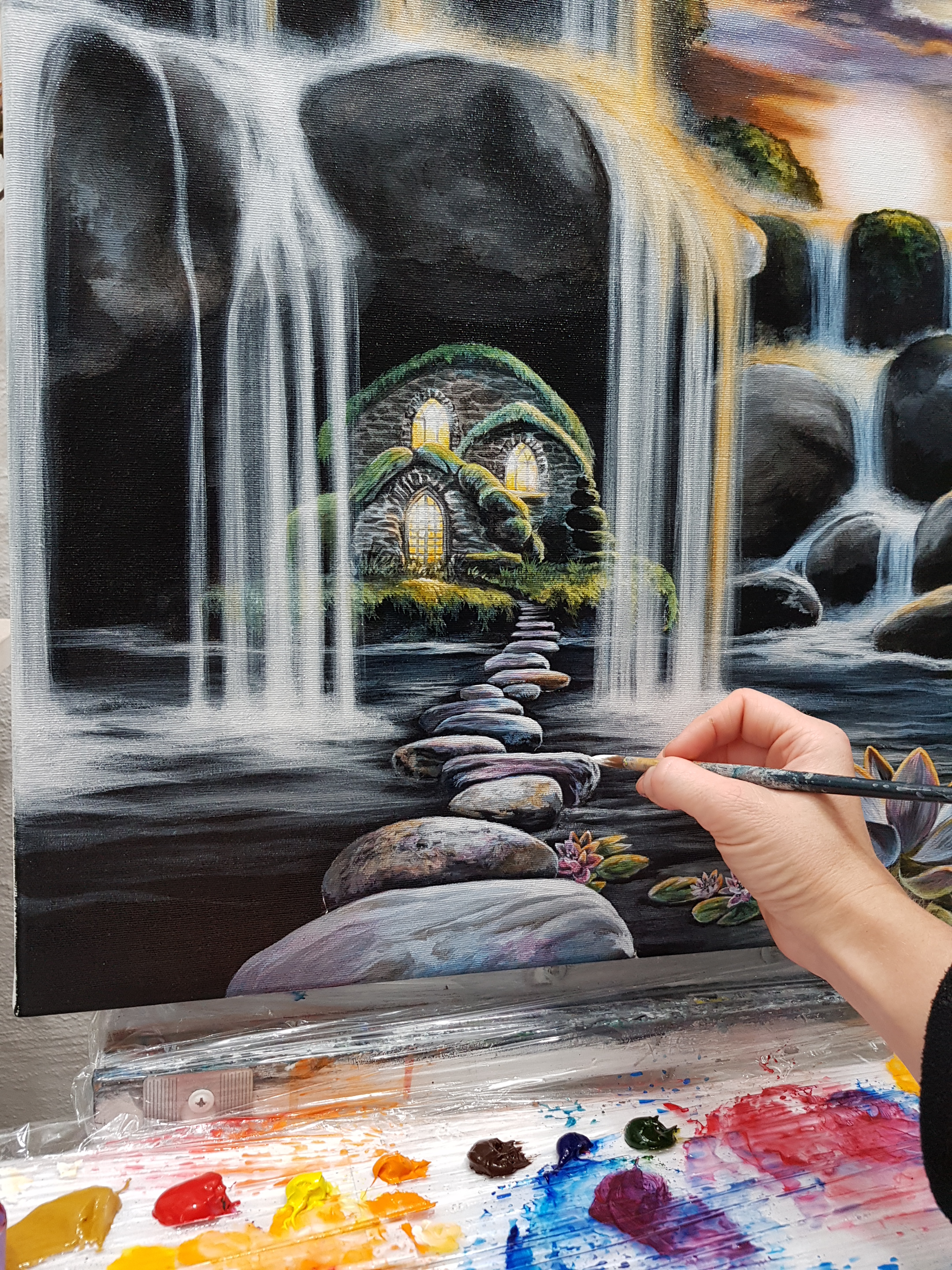 Det jag tänkte när jag ville måla denna bild var att skapa en skyddad plats, en stadig klippa där ingenting kan komma åt och förstöra. En gömd plats, och en plats för vila.