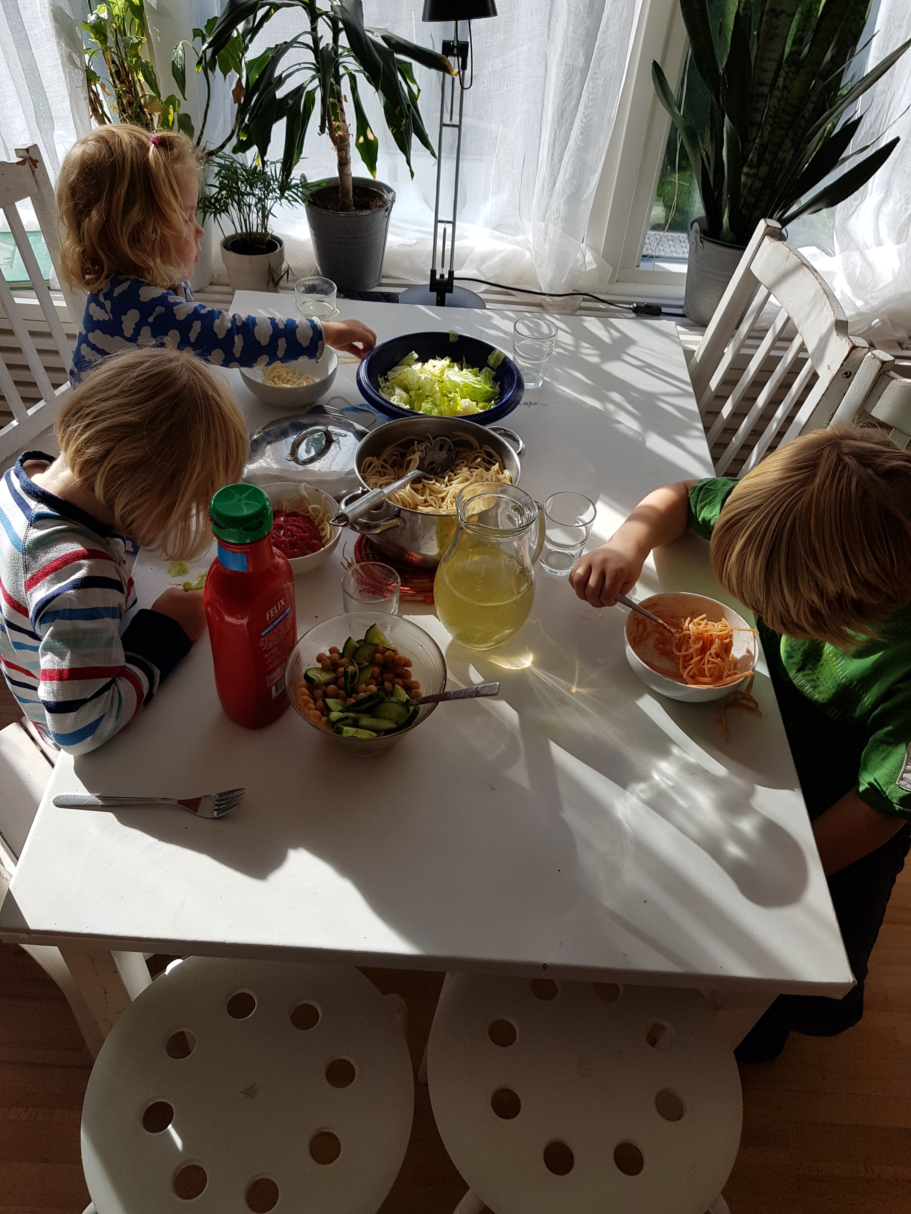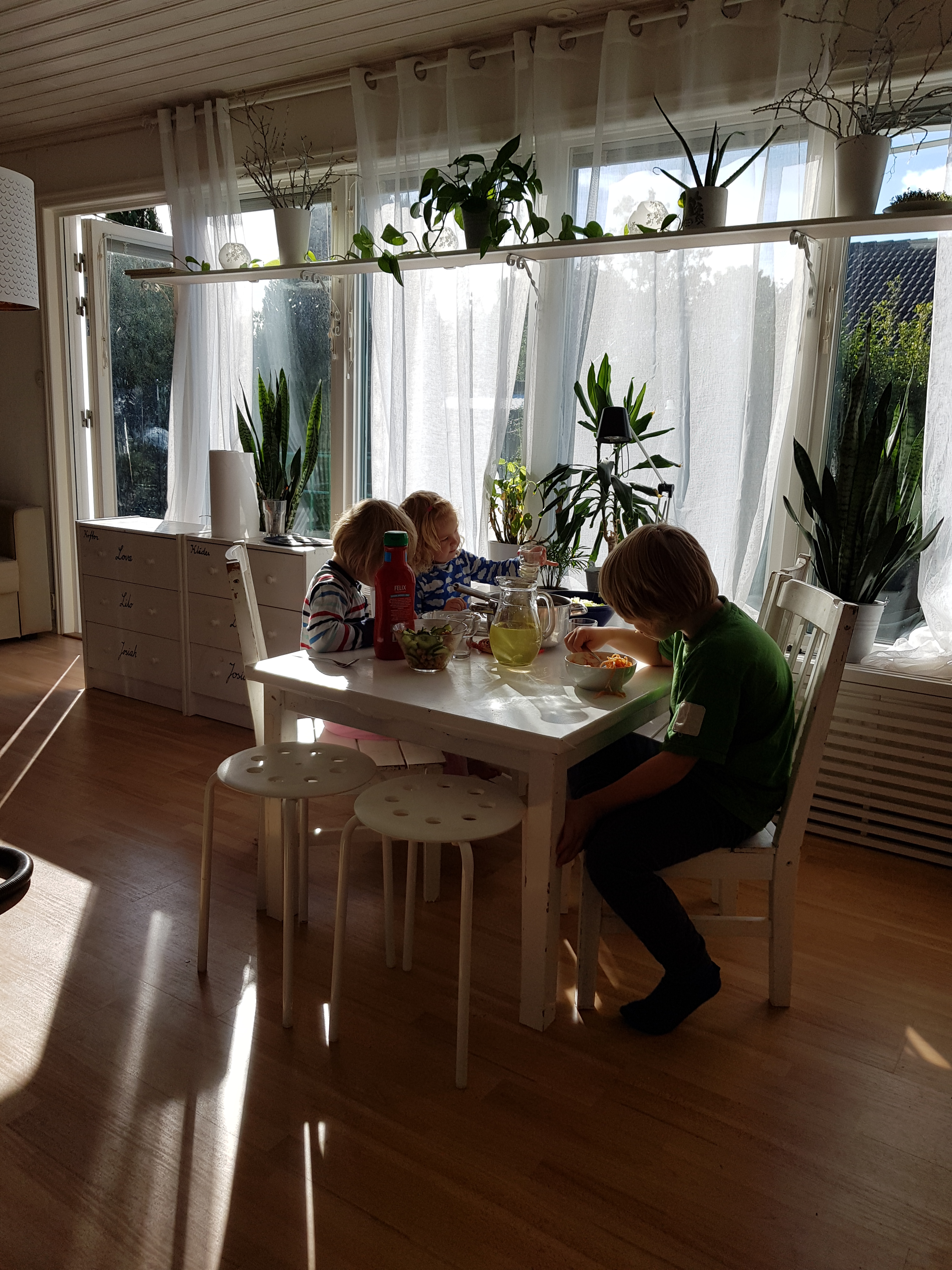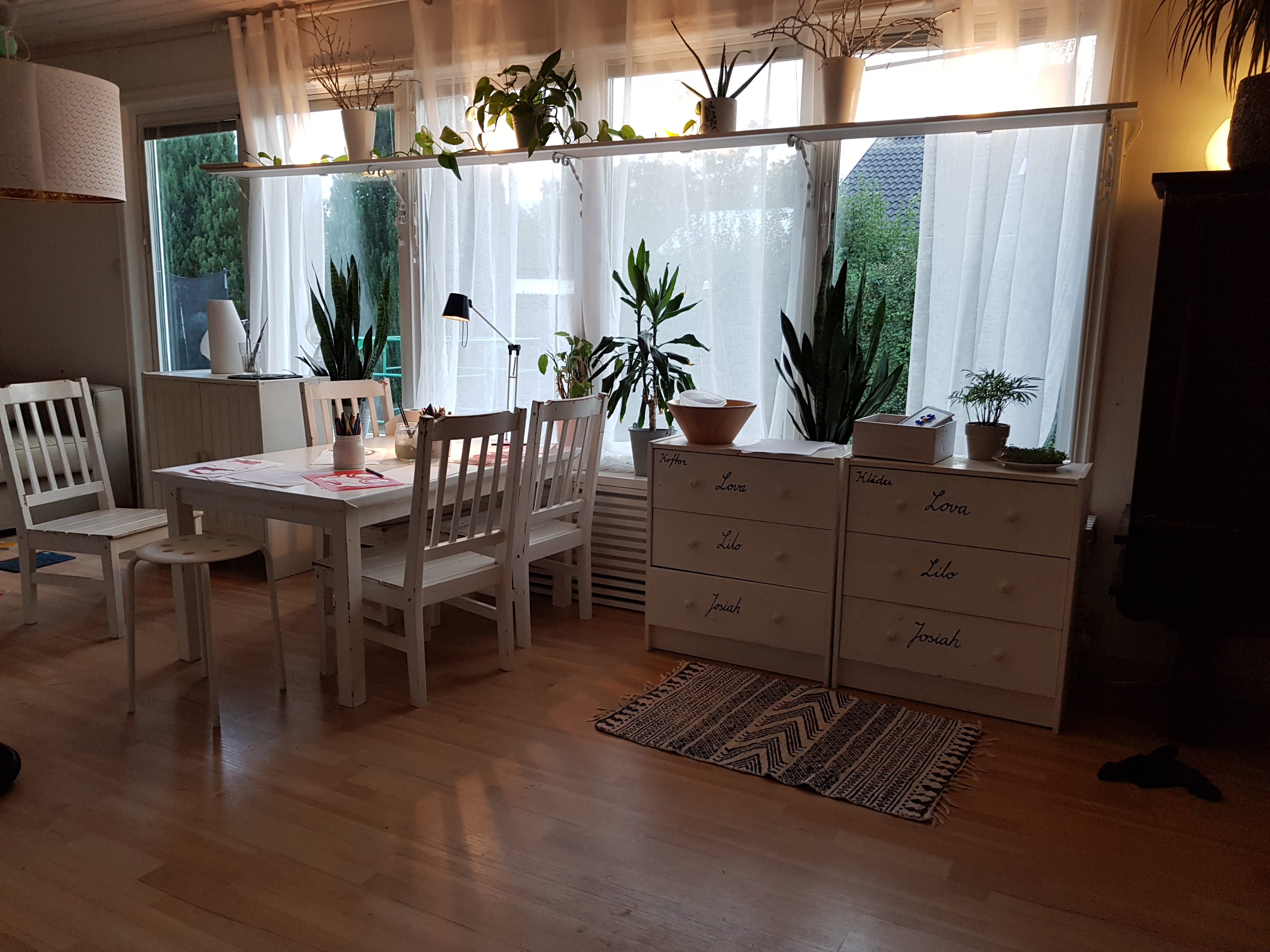 Jag kapade benen på ett bord o fyra stolar för att skapa ett pysselbord till barnen 😊 vi invigde möblerna genom att käka middag där. Lite lågt för oss vuxna dock haha.