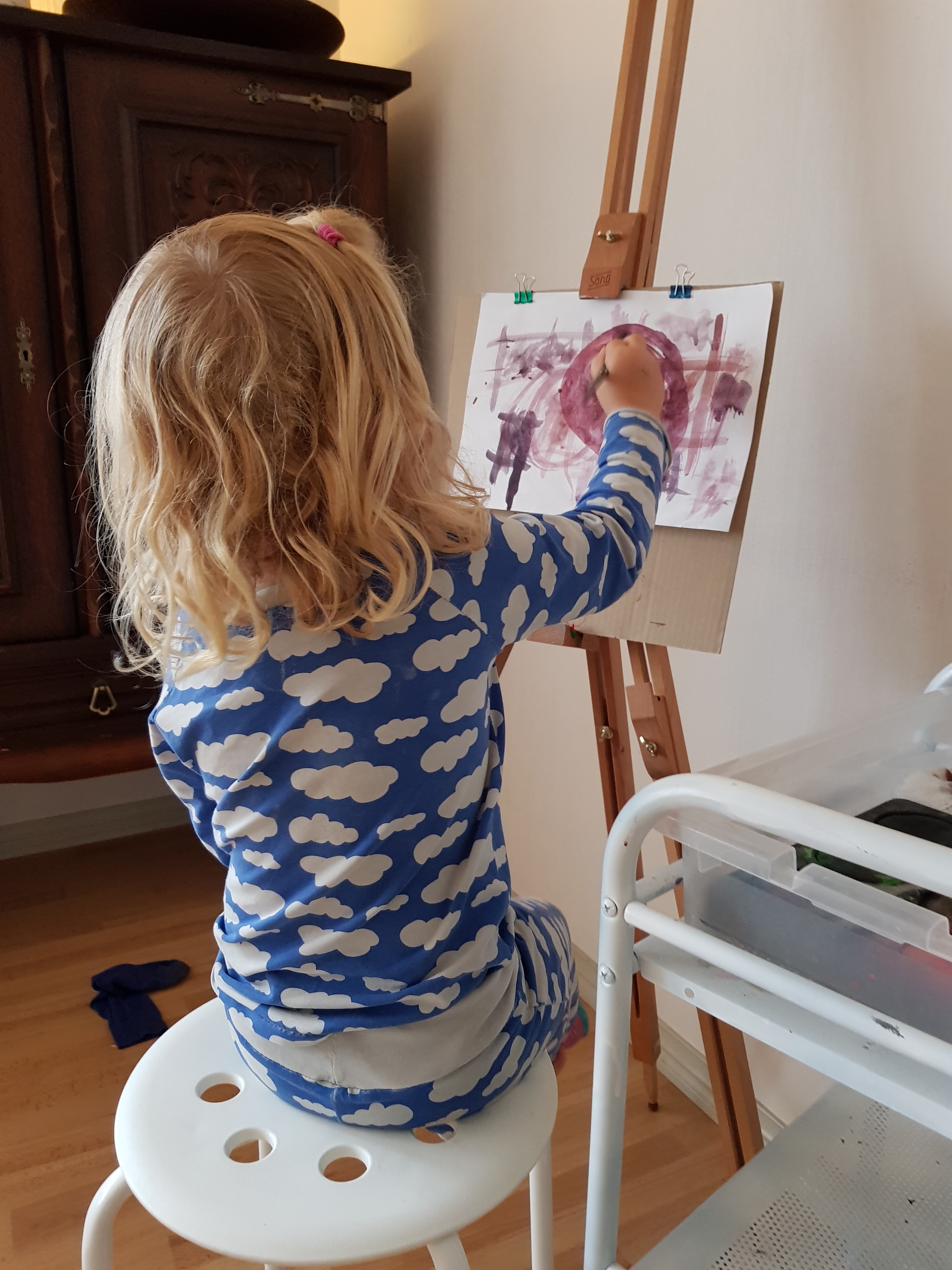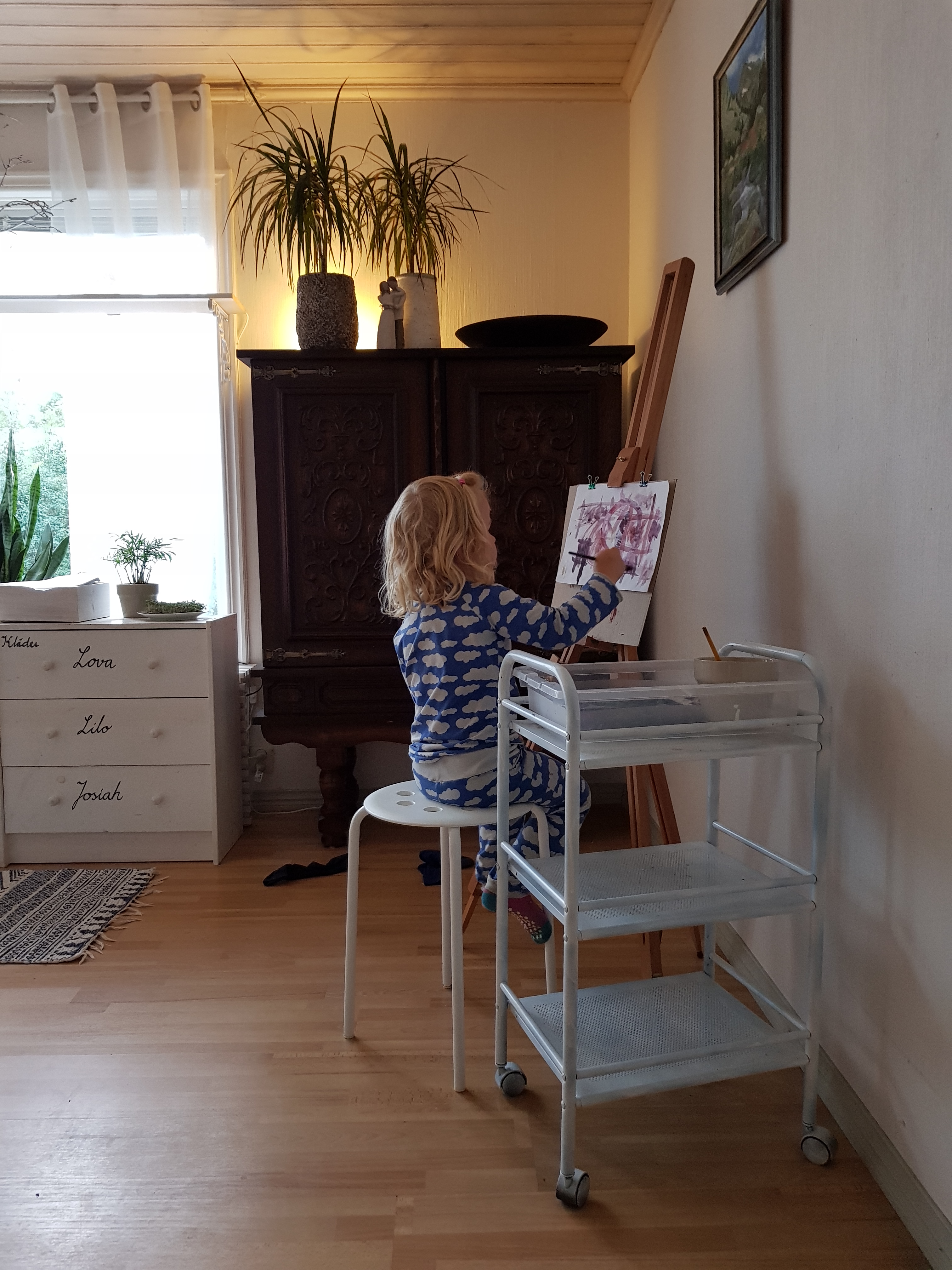 Jag har också gjort en studiolik hörna i vardagsrummet med mitt fältstaffli. Jag ska testa att våga låta vattenfärgerna ligga framme hela tiden. Få se hur det går. Lilla tjejen på bilden har nämligen dekorerat tapeter förr med vattenfärg… och spritpenna. Tror faktiskt hon är stor nog nu. Fyller fyra om några dagar och går att resonera med väldigt bra.