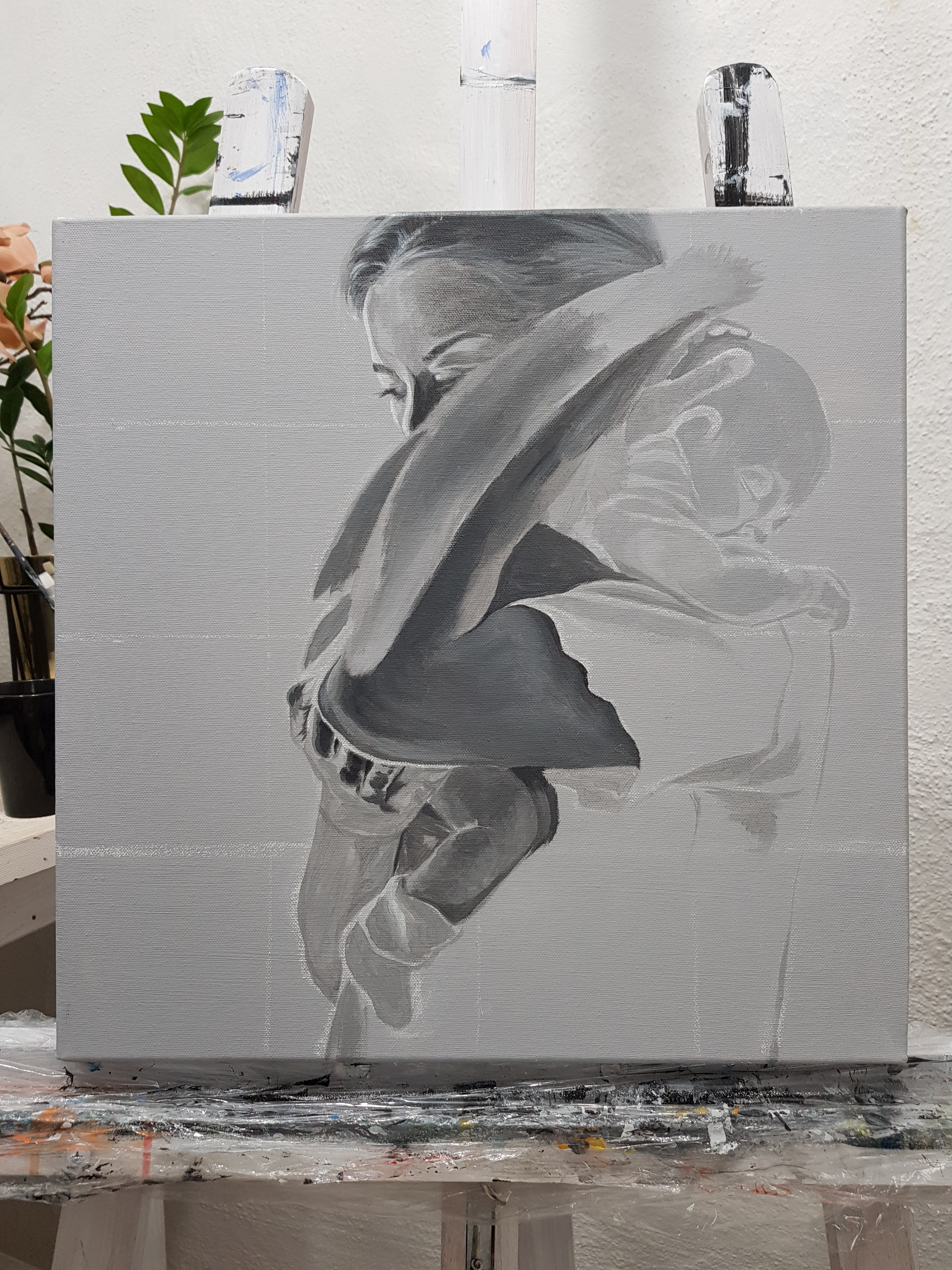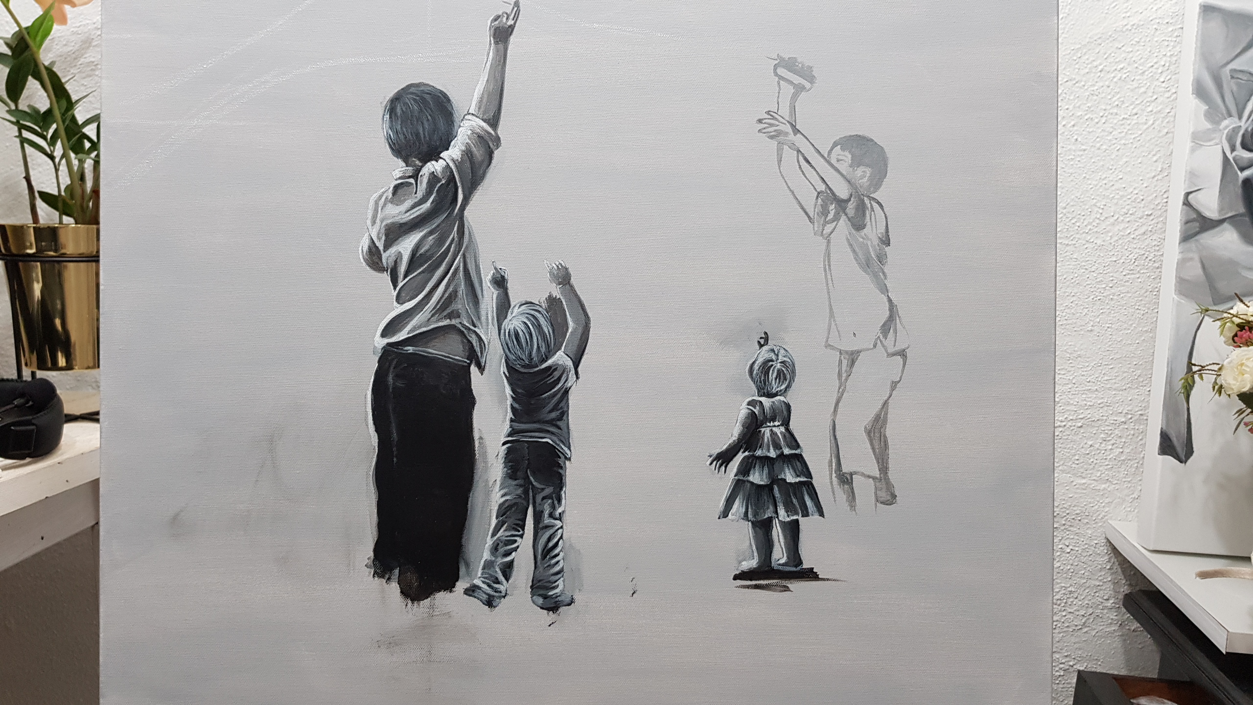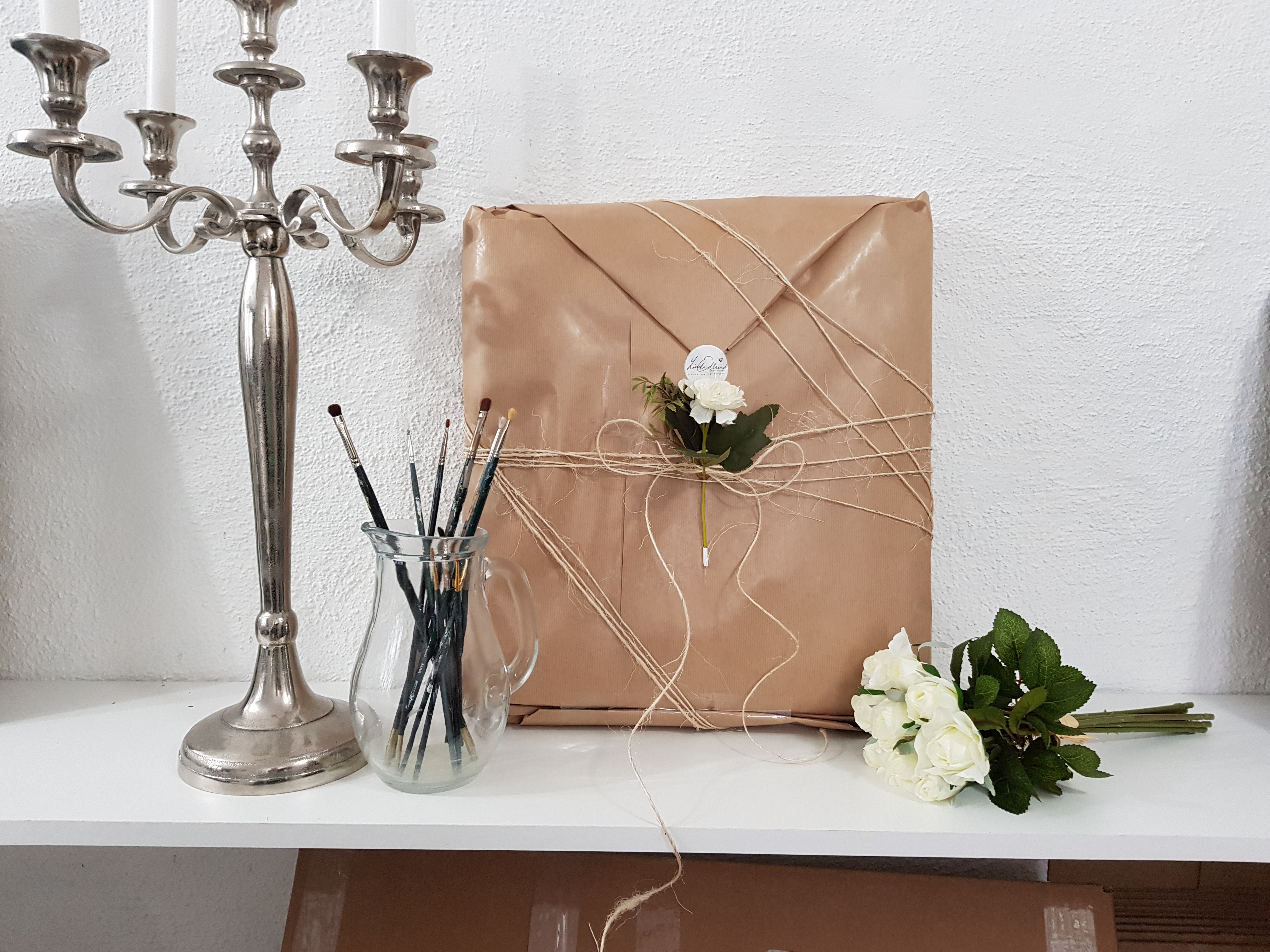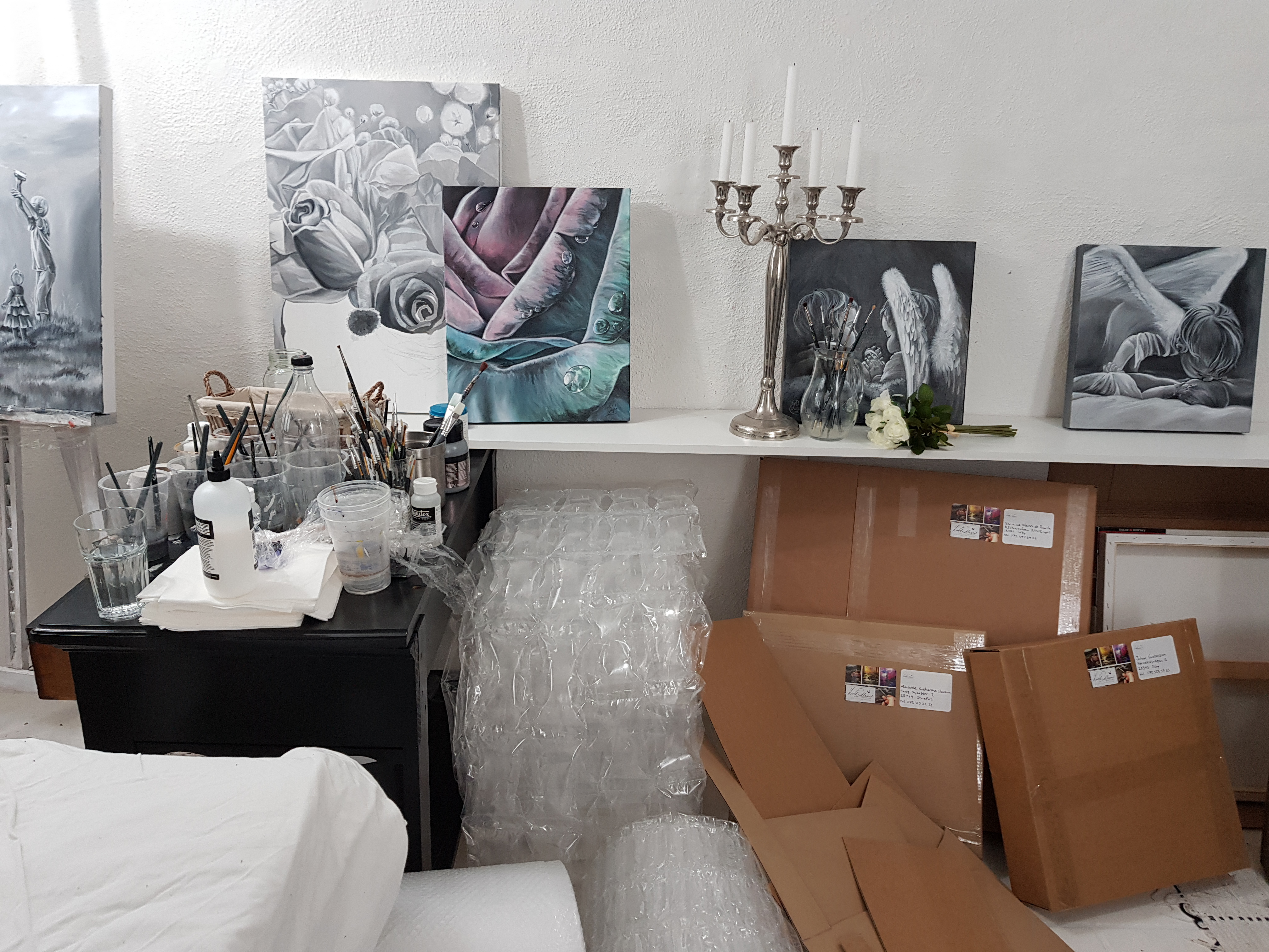 I min studio samsas penslar och halvfärdiga målningar med stora kartonger och mängder av bubbelplast. Här är tre målningar färdiga för flytt till nya hem.