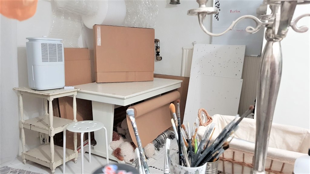 Så skönt att slippa pussla med bubbelplasten nu. Puh! De enorma kartongerna längst bak i bilden kan svälja målningar som är 80 x 100 cm :) Men jag gör sällan så stora för de är så klumpiga att förvara i studion. De packar jag mellan de enorma bubblorna till höger i bilden. Packning av målningar är en hel vetenskap. Men tumregeln är att emballaget hellre ska vara dyrare och spara tid, och vara säkert, än budget som man får krångla med, och som inte blir snyggt, och som kanske inte blir lika skyddande.