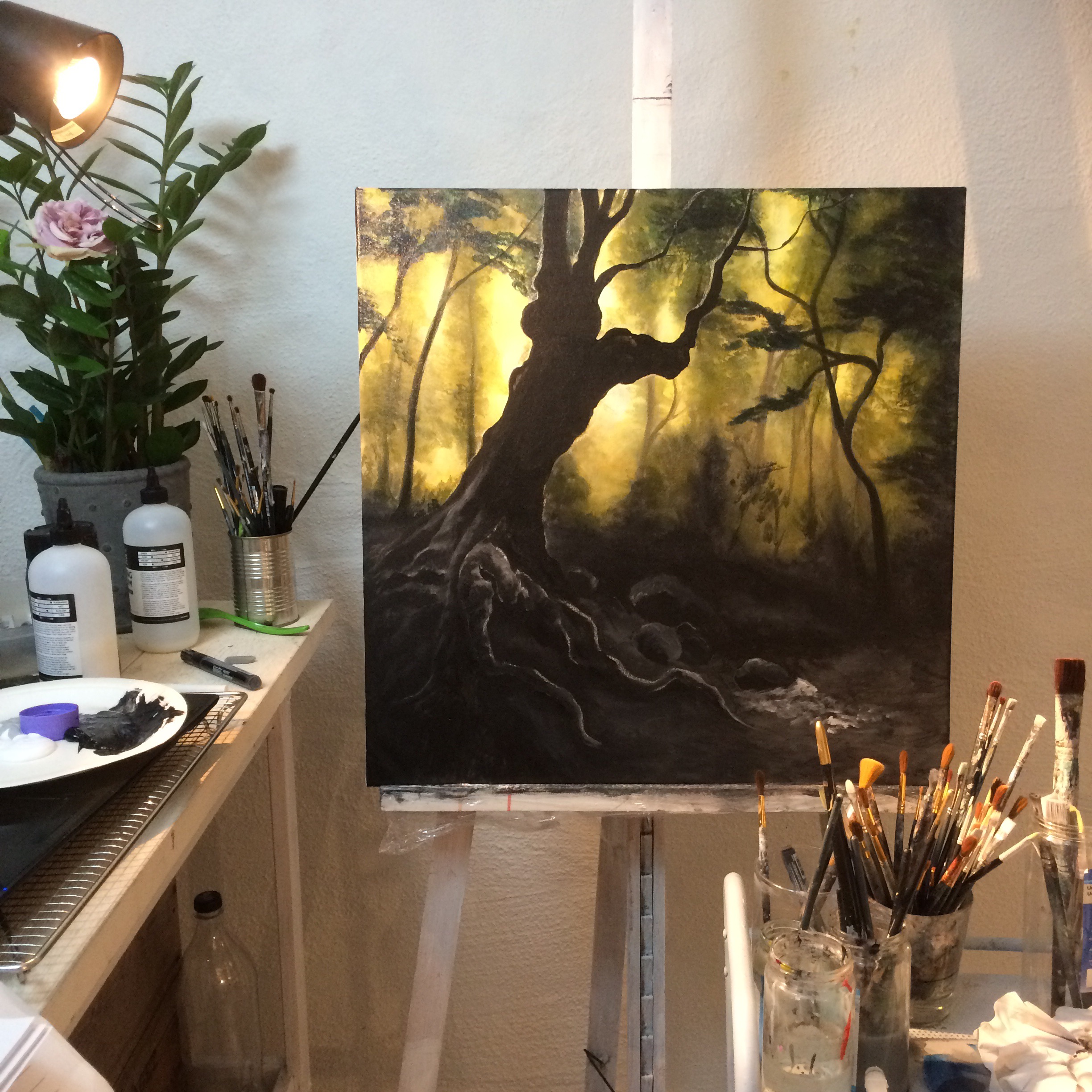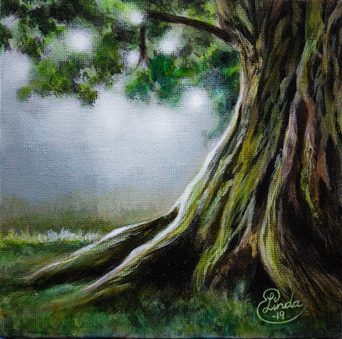 Minimålning Gammalt träd med stora rötter, Original Akryl på dukpannå, 15 x 15 cm,