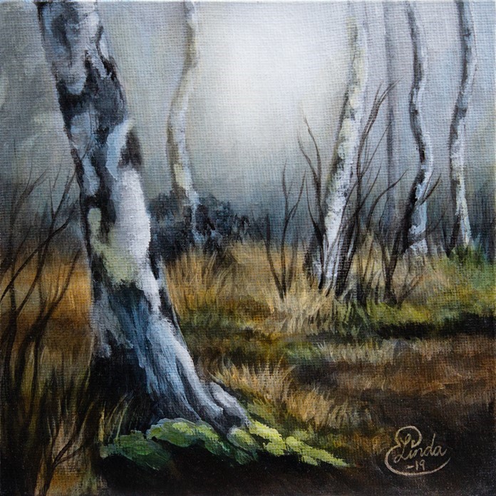 Minimålning björkar på Stiby backe – Original Akryl på dukpannå 15 x 15 cm,