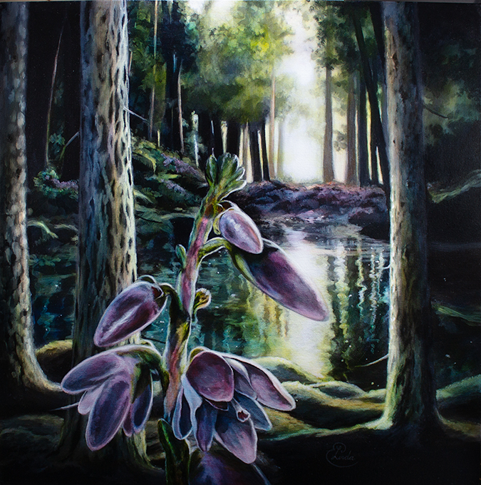 Ljung i Barrskog vid skogstjärn – Original, akryl på canvas 60 x 60 cm,